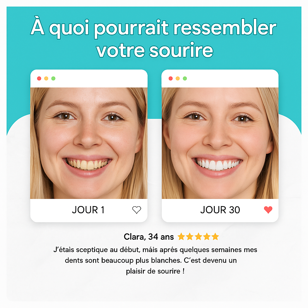 + Rapide : Parce que LumiBrush nettoie toutes les taches de surface simultanément, vous pouvez vous brosser les dents en seulement 30 secondes. Rapide, nous le savons ! Maintenant, imaginez en combien de temps vous brossez une dent de manière aussi efficace avec une brosse à dents manuelle standard ?